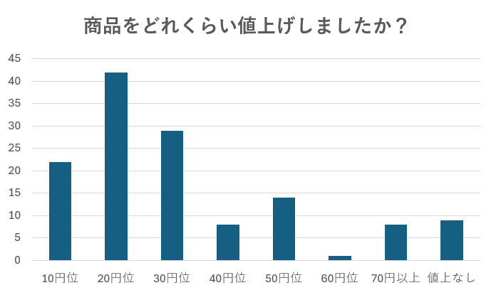 全国のパン屋オーナー133名に聞いたアンケートでは、一番多かったのは「20円くらいの値上げ」(42件)、次に「30円くらい」(29件)。