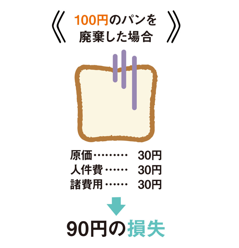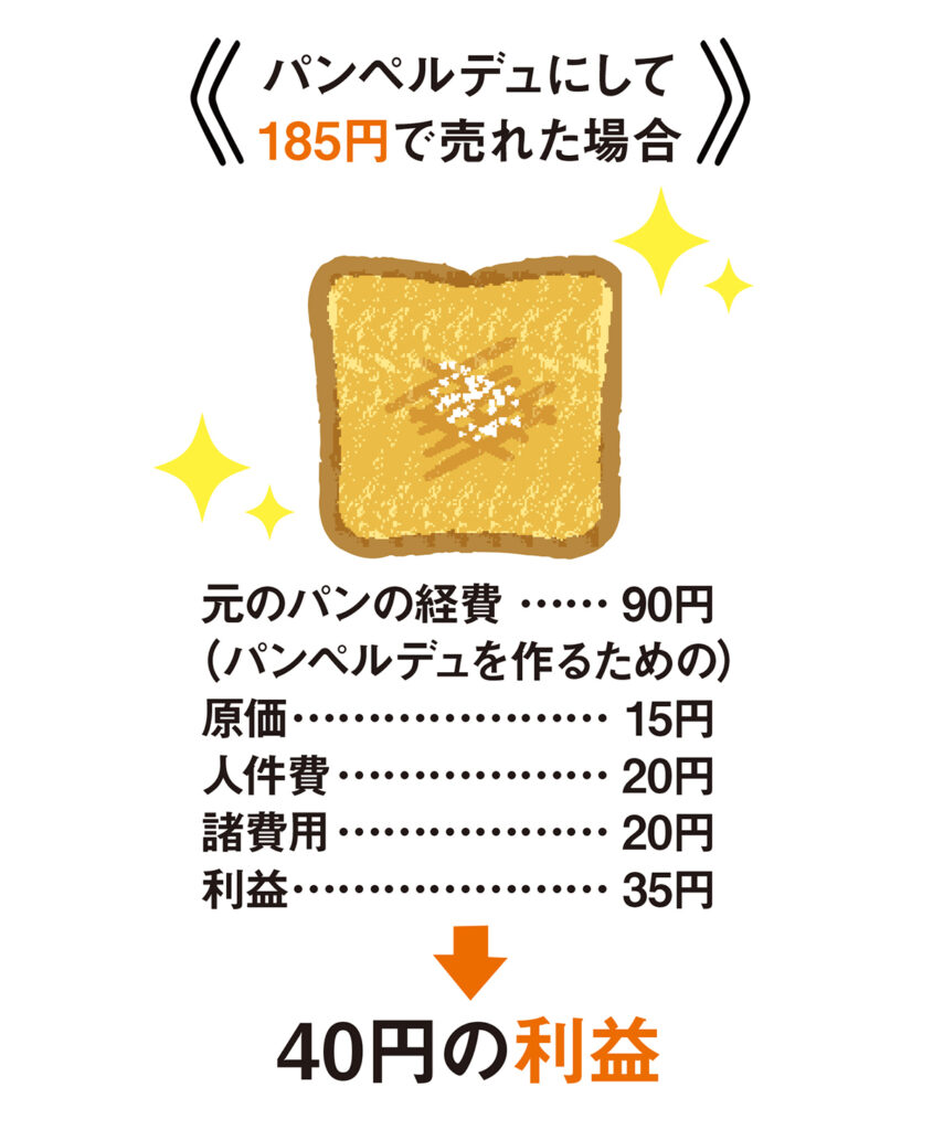 100円のパンをただ廃棄した場合、90円の損失ですが、パンペルデュにして185円で売れた場合は、パンペルデュを作るための原価や人件費を足しても、40円の粗利となります。パンペルデュを活用することで、それほど労力をかけずに売上アップを狙うことも可能なのではないでしょうか。